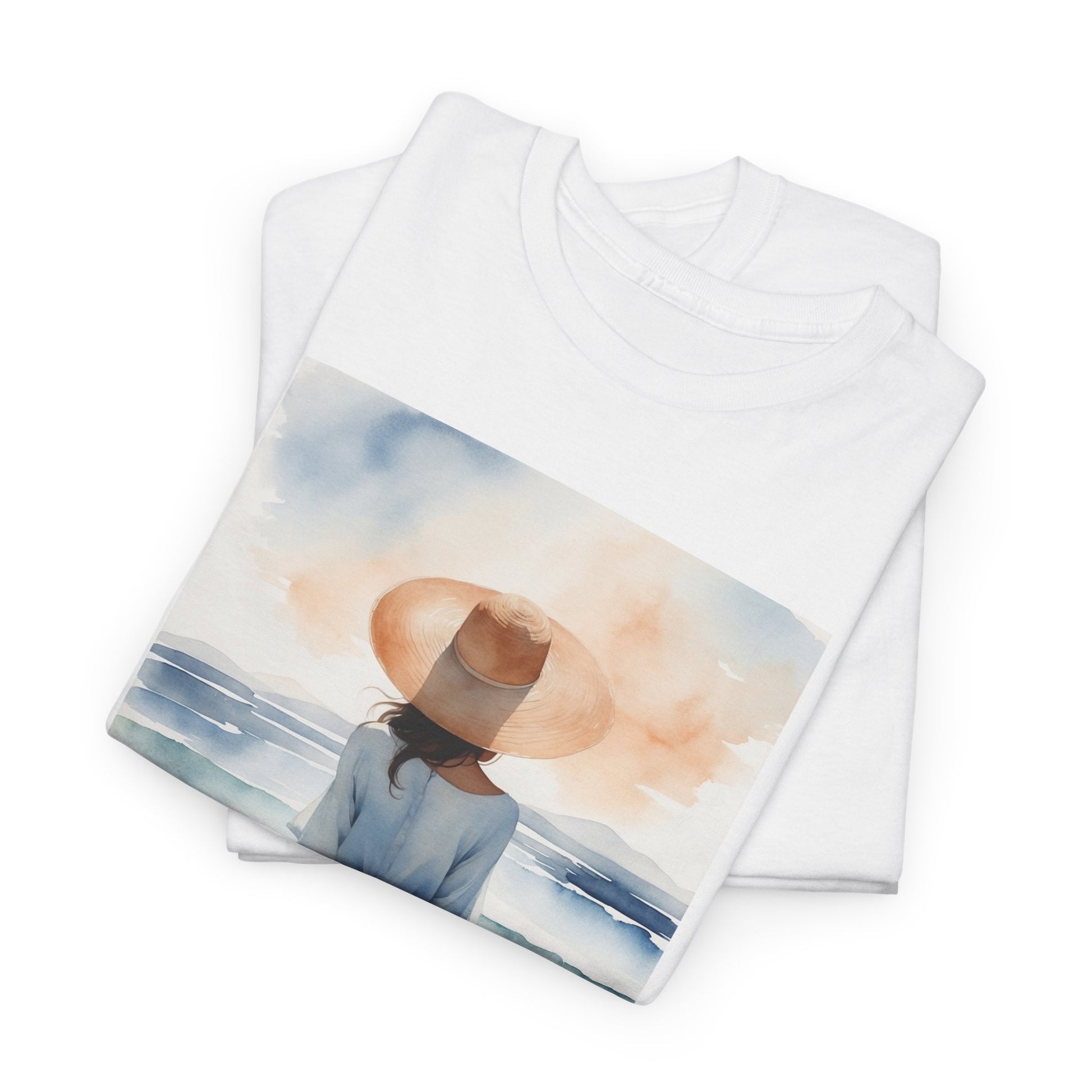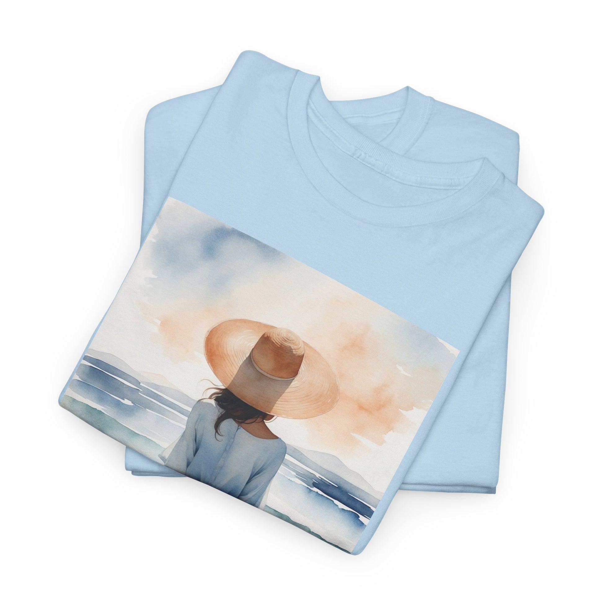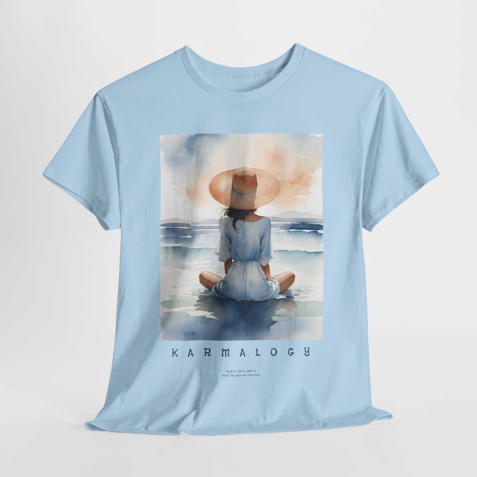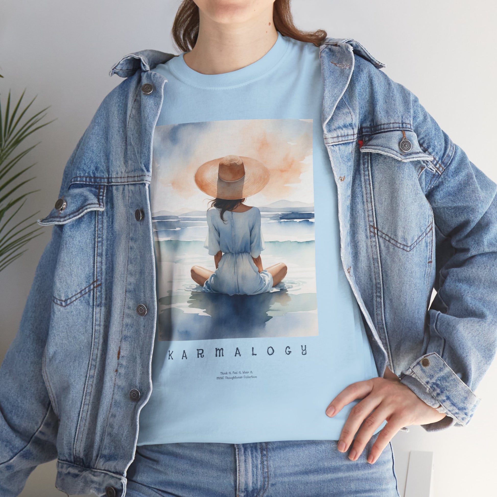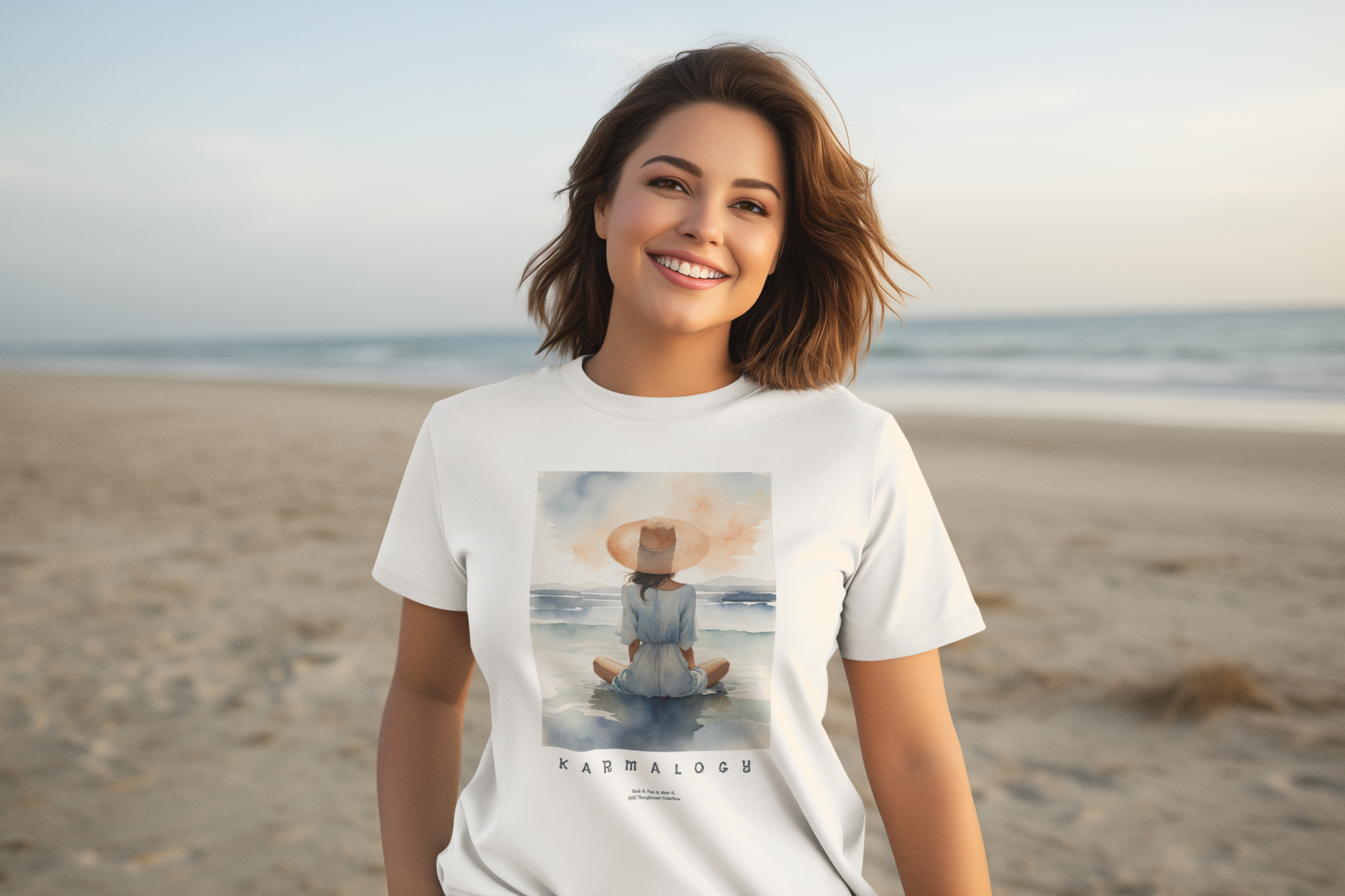 Celebrate the beauty of sunny days and peaceful moments with our Karmalogy T-shirt. Designed in a soft watercolor style, it features a serene beach scene of a woman wearing a sun hat, evoking feelings of relaxation, meditation, and harmony. Perfect for beach lovers, holiday enthusiasts, and those who love mindfulness. An ideal gift for those who love coastal vacations, yoga, and sunny days. Made from 100% premium cotton for comfort and style.