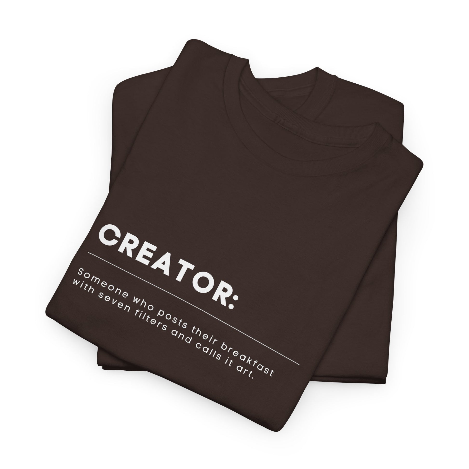 Voor de creatievelingen die hun cappuccino’s, katten of avocado toast altijd vanuit de perfecte hoek fotograferen – en voor iedereen die zichzelf net zo serieus neemt als hun Instagram-feed. Dit premium CREATOR T-shirt is een subtiele knipoog naar de wereld van content creators, influencers en digitale kunstenaars.
